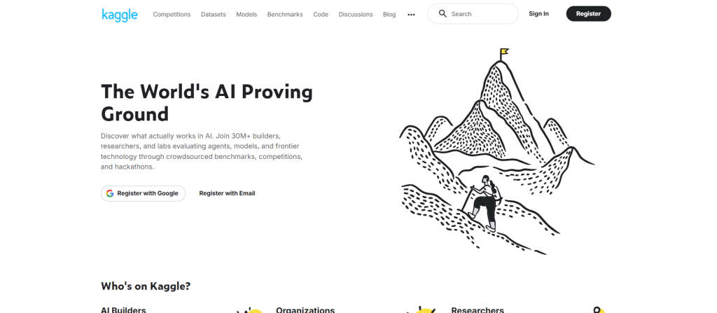 Kaggle không đơn thuần là một website học tập; nó là cộng đồng khoa học dữ liệu và trí tuệ nhân tạo lớn nhất thế giới. Được Google mua lại vào năm 2017, Kaggle đã phát triển thành một hệ sinh thái khổng lồ nơi các doanh nghiệp lớn đưa ra các bài toán thực tế kèm theo những giải thưởng lên đến hàng trăm nghìn USD.