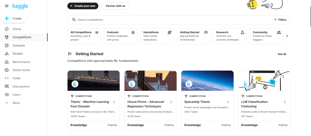 - Thử sức với “Getting Started” Competitions: Hãy bắt đầu với cuộc thi kinh điển như Titanic (dự đoán người sống sót) hoặc House Prices. Đây là những bài toán “vỡ lòng” có rất nhiều tài liệu hướng dẫn chi tiết.