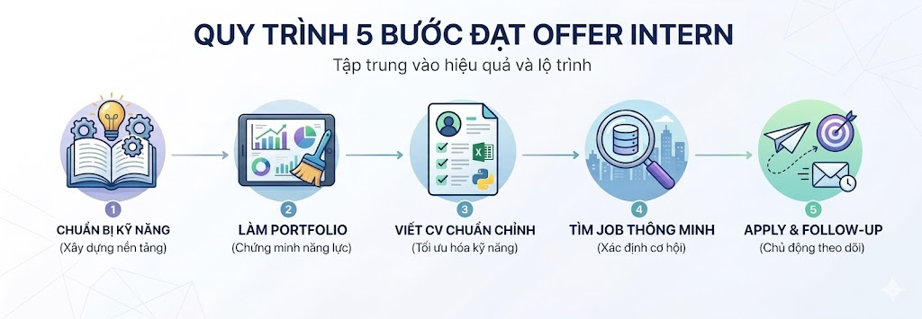 Để việc ứng tuyển Data Analyst Intern đạt hiệu quả cao nhất, bạn cần tuân thủ một lộ trình bài bản thay vì nhảy cóc. Hãy hình dung đây là một phễu chuyển đổi:
