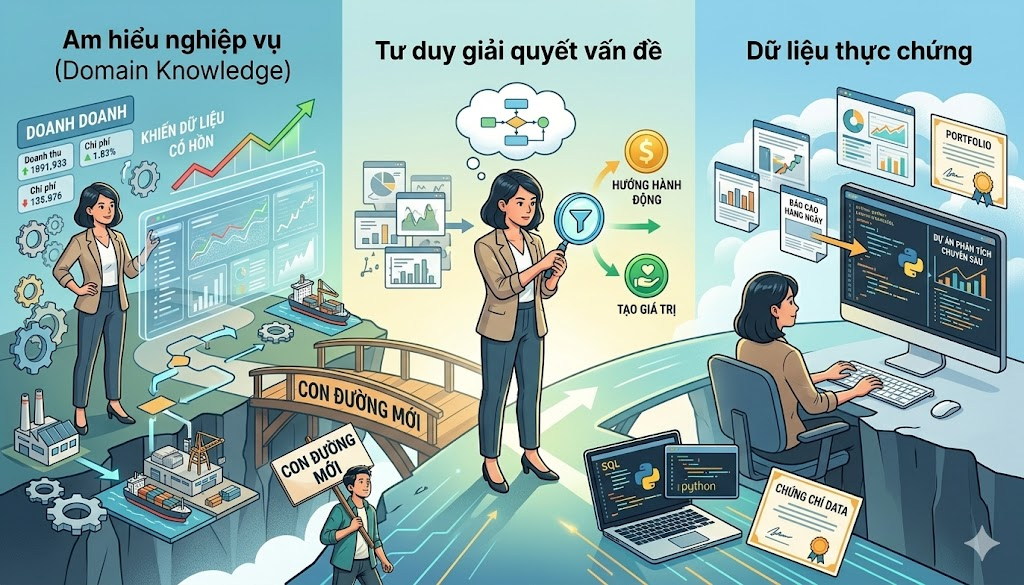 Nhiều người đi làm thường tự ti khi so sánh bản thân với các bạn sinh viên – những người có ưu thế về thời gian và khả năng tiếp thu công nghệ nhanh chóng. Tuy nhiên, họ lại quên mất rằng Data Analyst không chỉ là câu chuyện của công cụ. Dữ liệu thực chất chỉ là những con số vô hồn nếu không được đặt vào bối cảnh kinh doanh cụ thể. Đây chính là nơi mà kinh nghiệm làm việc thực tế của bạn trở thành một “vũ khí” tối thượng với ba lợi thế cốt lõi: