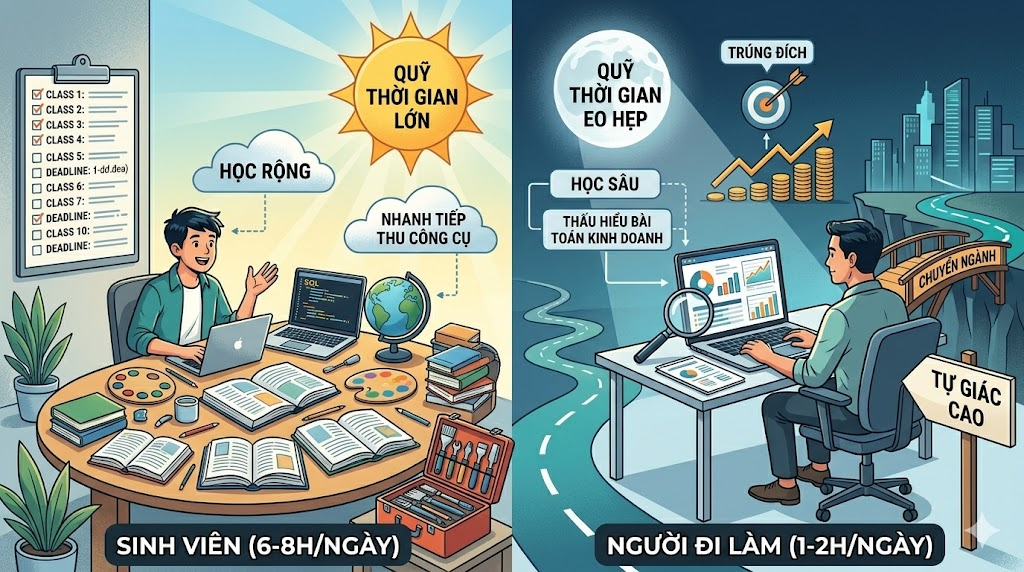 - Quỹ thời gian: Sinh viên có 6 – 8 tiếng/ngày, trong khi bạn chỉ có 1 – 2 tiếng. Điều này bắt buộc bạn phải học “sâu” thay vì học “rộng”.