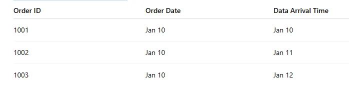 (Một ví dụ từ Medium – LAXMINARAYANA LIKKI) Nếu pipeline dữ liệu của bạn xử lý dữ liệu theo ngày, thì một bản ghi được gửi đến vào ngày 12/01 nhưng thực tế thuộc về dữ liệu của ngày 10/01 sẽ được xem là dữ liệu đến muộn (late-arriving data).