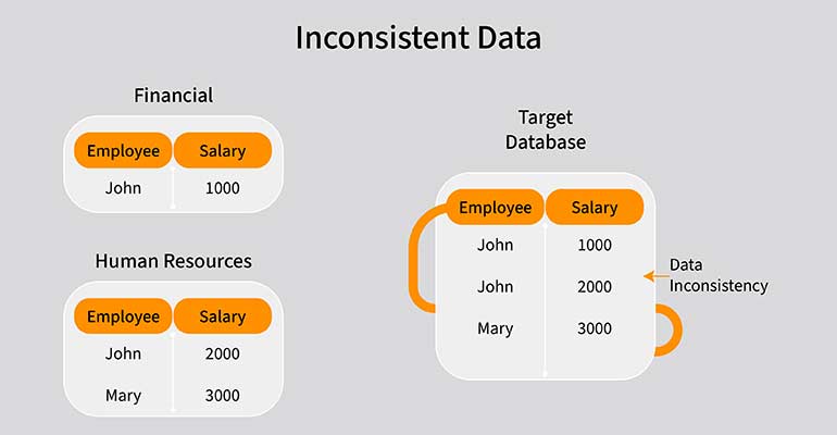 Khi dữ liệu chính được lưu trữ với dự phòng, nó có thể tác động xấu đến quy trình đầu cuối của doanh nghiệp. Ví dụ: khi các phiên bản khác nhau của dữ liệu chính tồn tại, mỗi hành động khác nhau để thực hiện đơn hàng, chẳng hạn như chuyển đơn hàng, thanh toán và các quy trình khác sẽ chuyển sang một tập dữ liệu chính khác.