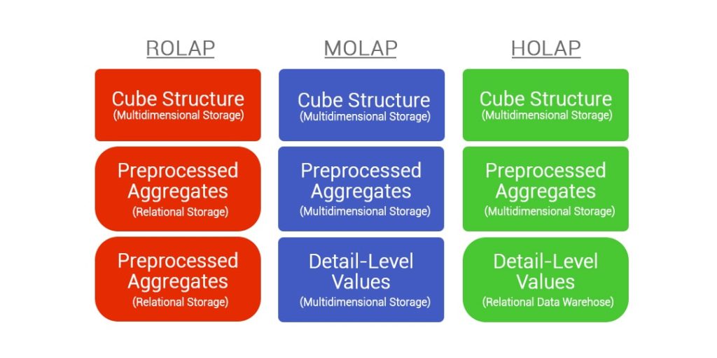 - MOLAP: Dữ liệu được tiền xử lý và lưu dưới dạng cube, cho hiệu năng rất cao nhưng khó mở rộng khi dữ liệu lớn.