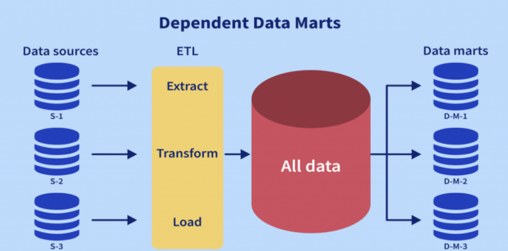 Dependent Data Marts là một tập hợp con hợp lý của một tập con vật lý của một Data Warehouse cao hơn. Theo kỹ thuật này, các data mart được coi như các tập con của Data Warehouse. Trong kỹ thuật này, trước hết một Data Warehouse được tạo ra để từ đó có thể tạo thêm các Data Warehouse khác nhau. Các Data Warehouse này phụ thuộc vào Data Warehouse và trích xuất bản ghi cần thiết từ đó. Trong kỹ thuật này, khi Data Warehouse tạo ra data mart; do đó, không cần tích hợp data mart. Nó còn được gọi là cách tiếp cận từ trên xuống.